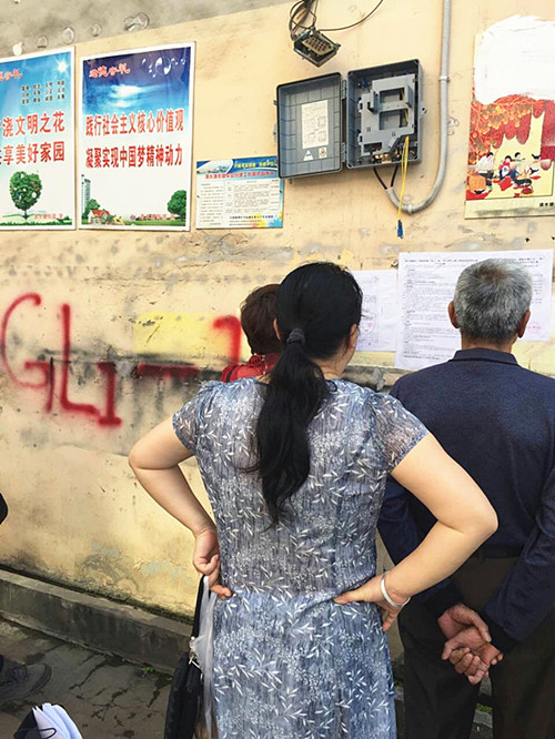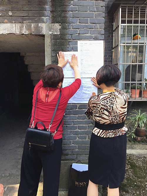 (征收工作人员张贴房屋征收调查公告)